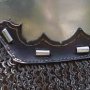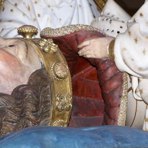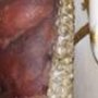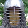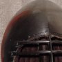 By the late 14th century, bascinets had stitched in padded liners as evidenced by small holes perforating the outer edge of extant examples. There are also some cervaliers (skull caps) from much earlier in the century that have this detail. It's not illogical to have a stitched in liner, as it is what is often used in hard hats, and fireman helmets. It keeps the helmet suspsended away from your head. Period examples may have been linen stuffed with horsehair, linen, cotton, or fustian (cotten and linen). This one is made from layers of canvas and linen for strength, and has 6 layers of fused 100% cotton batting with channels oversewn over all of the layers. After completing this project, not only did my head sweat a lot less, but the blows I was taking to the head seemed dampened a bit more, either from the suspension design or perhaps because of the soft cotton batting. Shown in the first picture is a detail of the aventail liner from the effigy of Philip the Bold (c.1404). The second picture showing the proper line of an aventail hanging from the bascinet on the effigy of Edward, "the Black Prince". |
